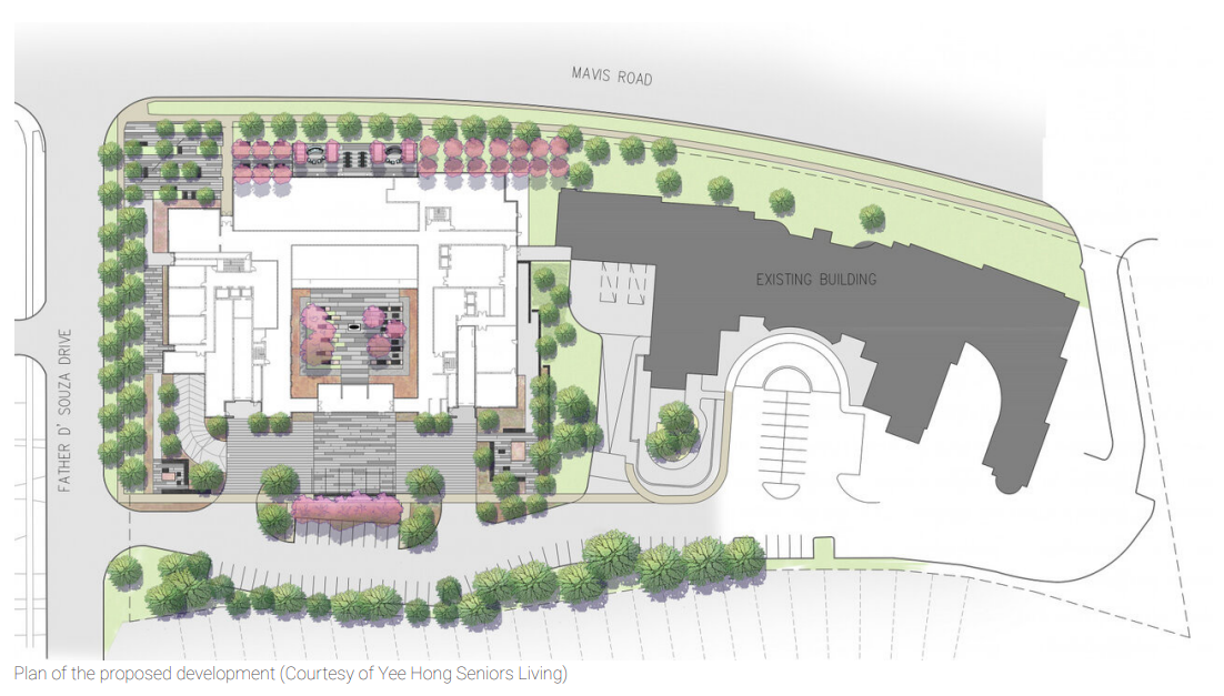 The site is located at the southwest corner of Mavis Road and Father D’Souza Drive. The southern portion of the lands are currently occupied by a 5-storey 200 bed long-term care home, and the northern portion of the lands are vacant.